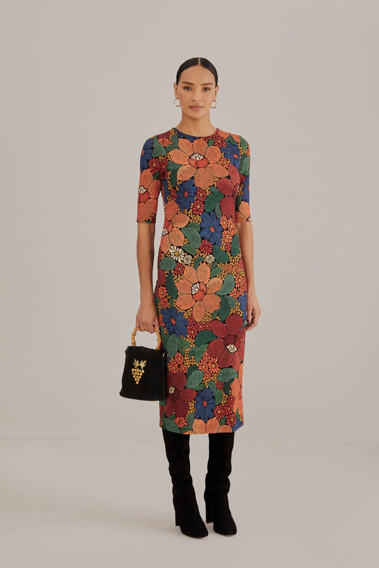 BLACK STITCHED FLOWERS LENZING™ ECOVERO™ VISCOSE MIDI DRESS